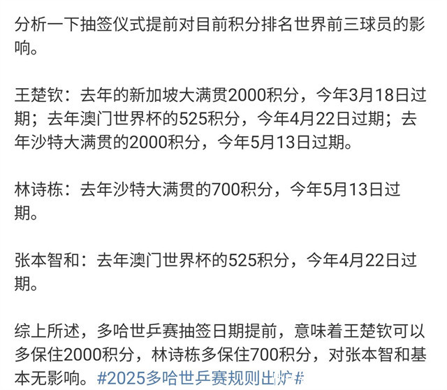 从网上好多网友的质疑声来看,提前半个月抽签,国乒是受益者。以现在积分名次寰球前三的男单球员来看:王楚钦客岁的新加坡大满贯2000积分,本年3月18日逾期;客岁澳门寰球杯的525积分,本年4月22日逾期;客岁沙特大满贯的2000积分,本年5月13日逾期。林诗栋:客岁沙特大满贯的700积分,本年5月13日逾期。张本智和:客岁澳门寰球杯的525积分,本年4月22日逾期。