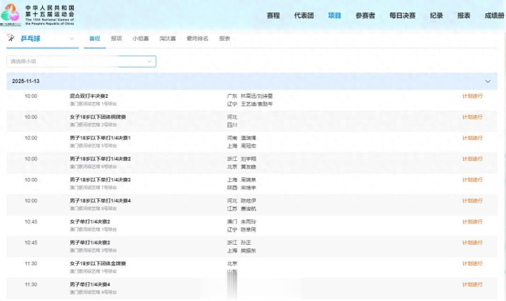 13日,2025全运会乒乓球络续进行,成年组进行单打1/4和混双半决赛。