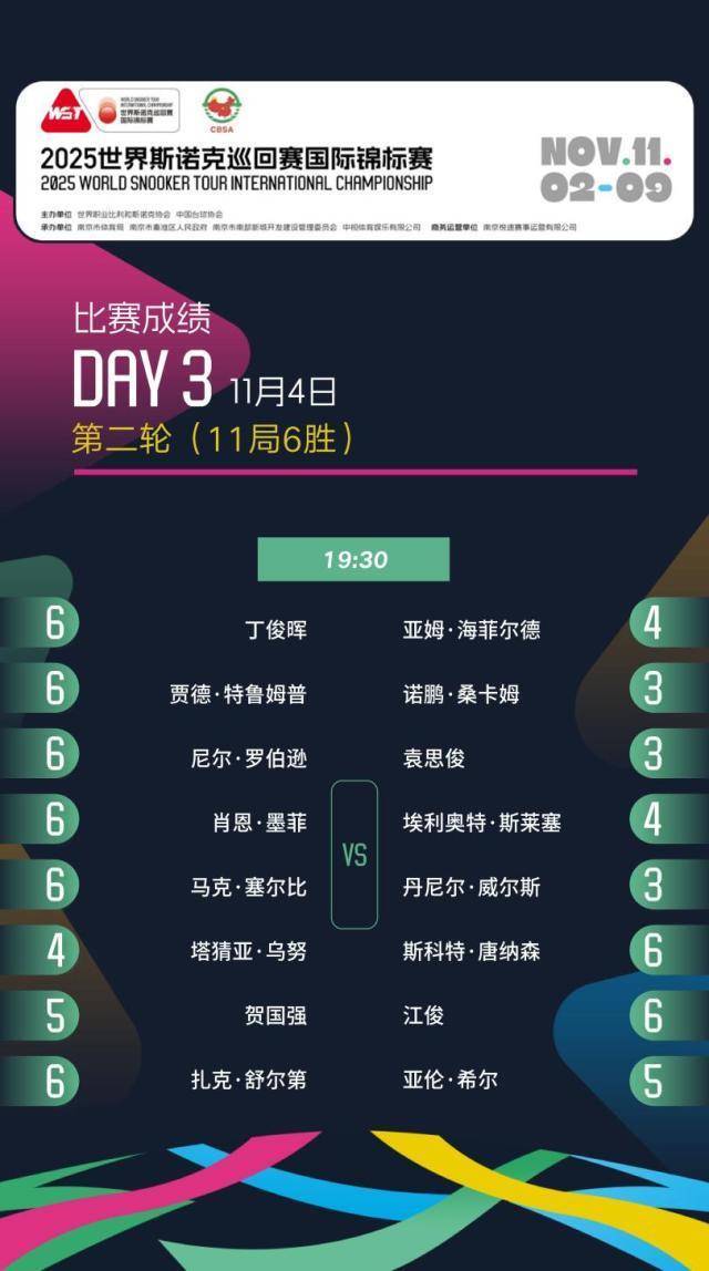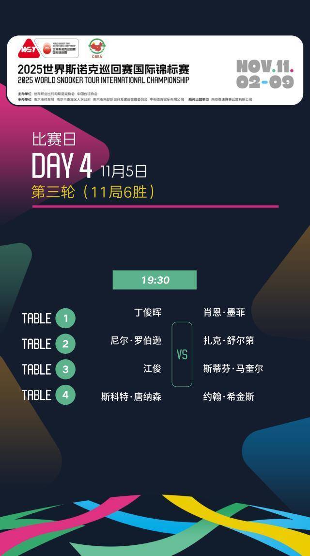 至此2025寰球斯诺克巡回赛国外锦标赛16强全部出炉,前16选手共有13东说念主参加本次赛事,其中有9东说念主到手完成晋级。中国军团在第三比赛日赢得五胜四负得益。11月5日,国锦赛1/8决赛将细腻打响,下昼时段特鲁姆普对阵中国小将吴宜泽,麦克吉尔挑战塞尔比,新科世锦赛冠军赵心童将和最近情状火热的斯佳辉献艺中国德比。晚间,丁俊晖遇到劲敌墨菲,“巫师”希金斯、尼尔·罗伯逊两位种子球员的敌手区分是唐纳森和舒尔第,江俊则是与马奎尔争夺8强席位。