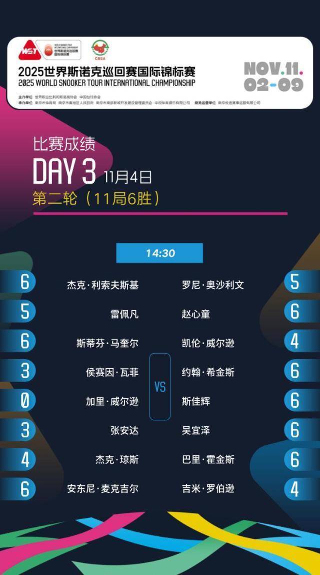 下昼的两场内战,23年国锦赛冠军张安达对阵吴宜泽,开局阶段张安达打出单杆136先拔头筹,之后比赛两边各胜两局,但从第6局驱动,吴宜泽打出三杆破百和一杆50+,连下4城以6比3将比赛收割。另外一场,赵心童与雷佩凡联手孝敬一场难题盛宴。雷佩凡轰出1杆破百及4杆50+,赵心童则老成回敬4杆50+,两东说念主扫数战至5比5平。决胜局中,赵心童叮嘱压力打出单杆62分,以总比分6比5险胜晋级。