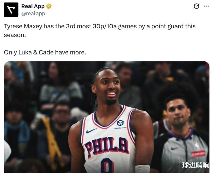 凭借这么的发达,马克西本赛季依然3次单场至少交出30分10助,高居控卫位置第三,仅次于东契奇7次与坎宁安6次。