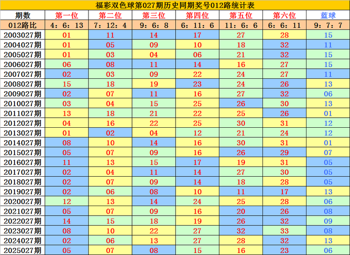 蓝球分析:第027期历史同时蓝球号码012路比开出9:7:7,在前5年同时奖号中,1路蓝球走冷,本期不看好1路蓝球,参考蓝球11。