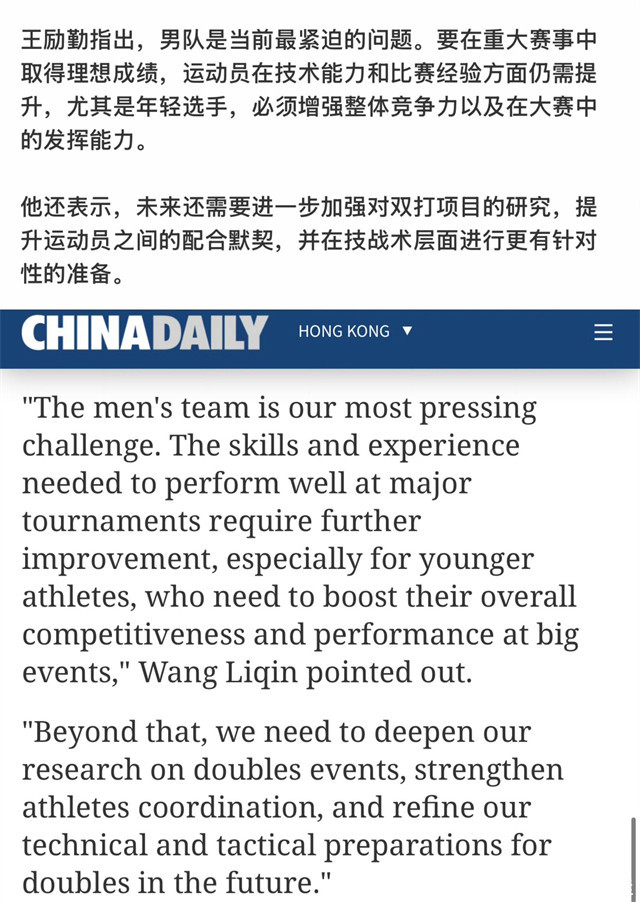樊振东无法回回国度队,关于王励勤来说亦然一个辣手的问题。在《中国日报》采访中,王励勤回报了国乒刻下所濒临的窘境。他承认,男队是刻下最遑急的问题,思保住大赛成绩的话,需要在时候和比赛解说方面进行栽培,要在首要赛事中获得理思成绩,畅通员在时候智商和比赛解说方面仍需栽培。马龙和樊振东一离开,王楚钦所谓的“领军东谈主期间”在外协冲击下十分莫名,国乒男队在洛杉矶周期很难站稳。