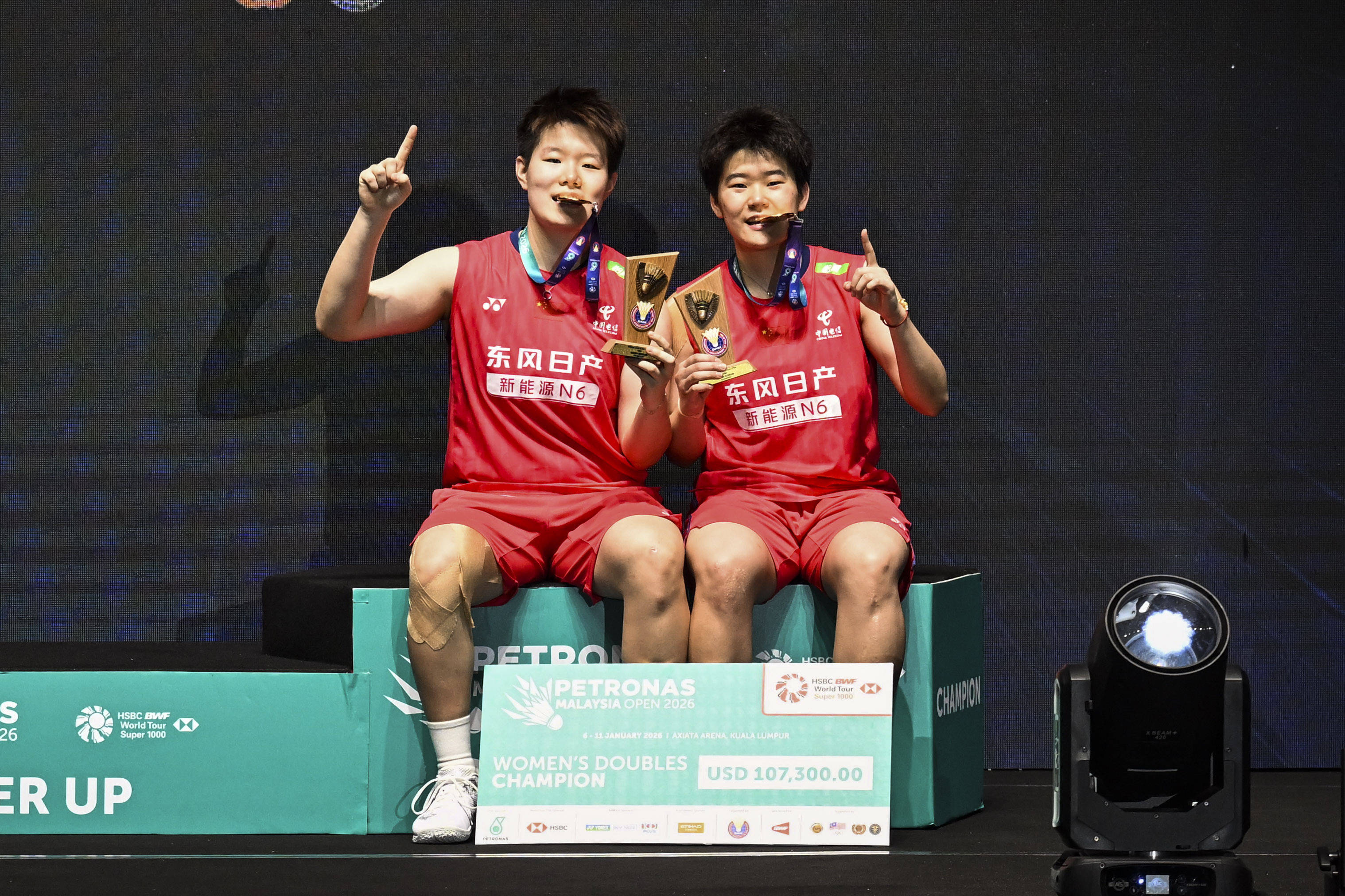 1月11日,女双冠军刘圣书/谭宁(右)在授奖庆典上合影。新华社记者 程一恒 摄此外体育最新信息,韩国组合金元浩/徐承宰摘得男双冠军。